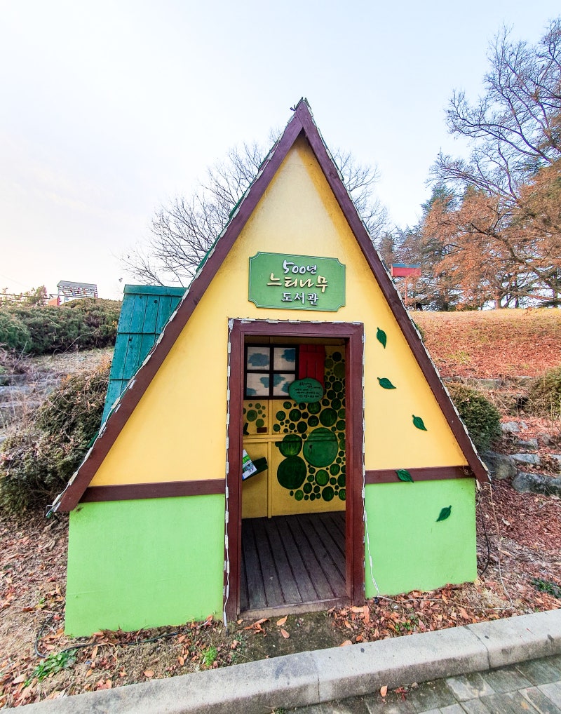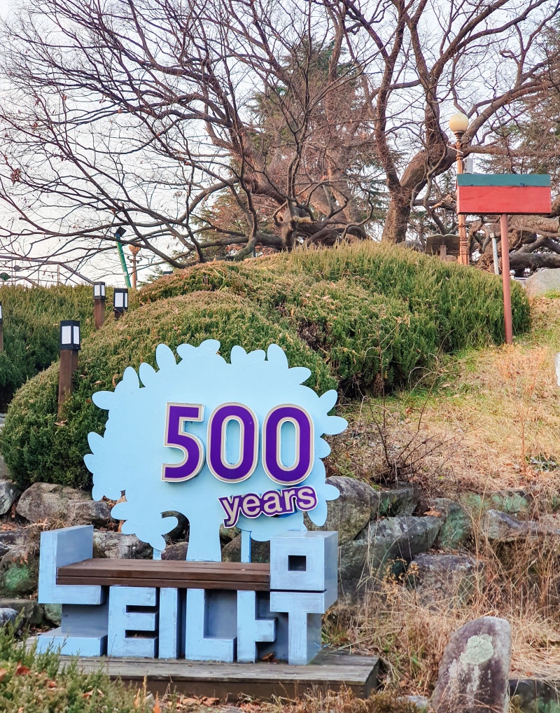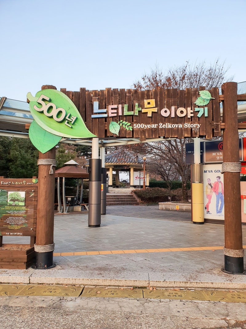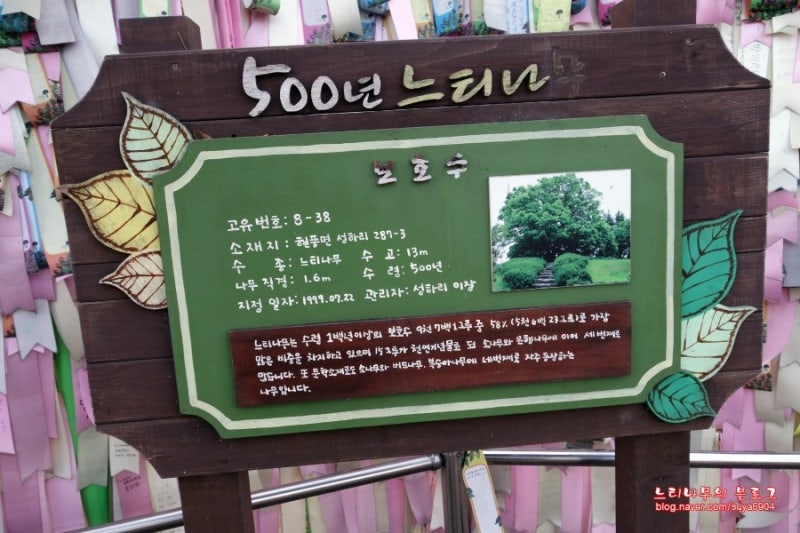 느티나무는 우리나라에서 소나무와 은행나무에 이어 세 번째로 많은 15그루가 천연기념물로 지정되었다는 내용과 500년 전 느티나무에 대한 제원으로 전해지고 있는 이야기에 대한 안내 문구